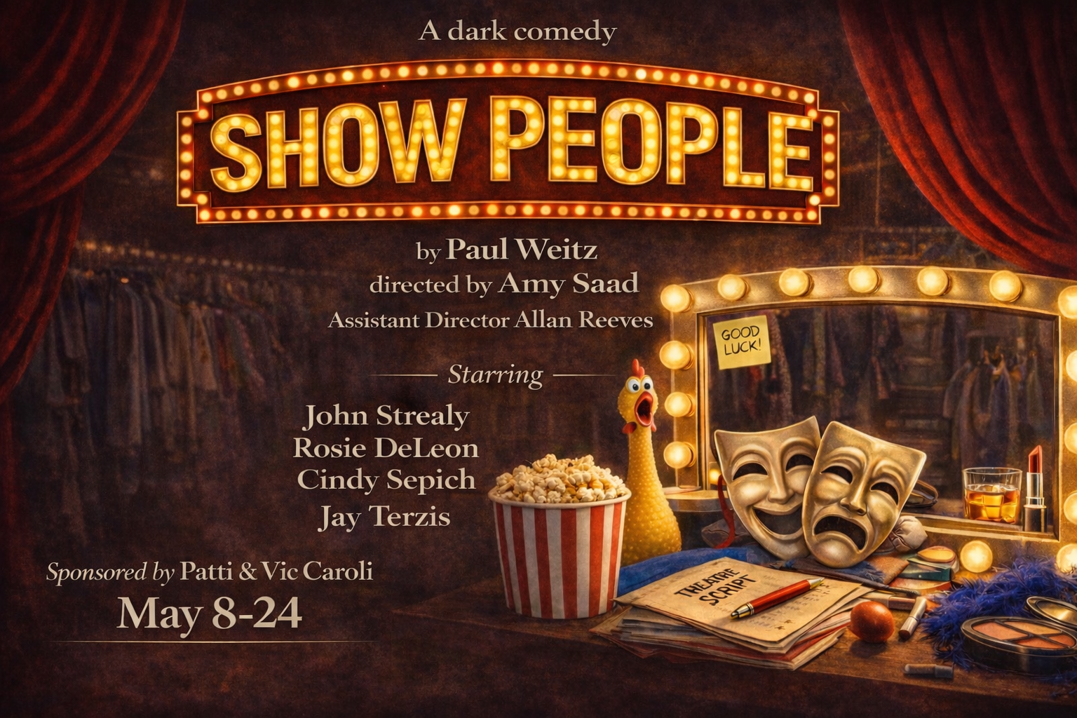 Directed by Amy Saad. AD Allan Reeves - Show People by Paul Weitz will close out the season, running May 8 through May 24, 2026. Jerry and Marnie are Broadway actors who haven't worked in years. At Jerry's insistence, they take a on WILDLY unorthodox job for a rich, young New York banker in SHOW PEOPLE, a comedy about the darker aspect of the need to create, perform and remain relevant. Starring John Strealy, Rosie DeLeon, Cindy Sepich & Stan Zawatsky